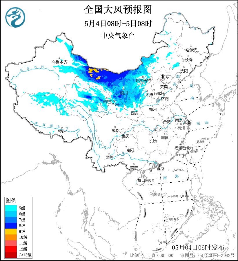 预计,5月4日08时至5日08时,新疆东部、内蒙古中西部、甘肃大部、青海中北部、宁夏、陕西中北部等地有5~7级、阵风8~10级、局地11级的大风。