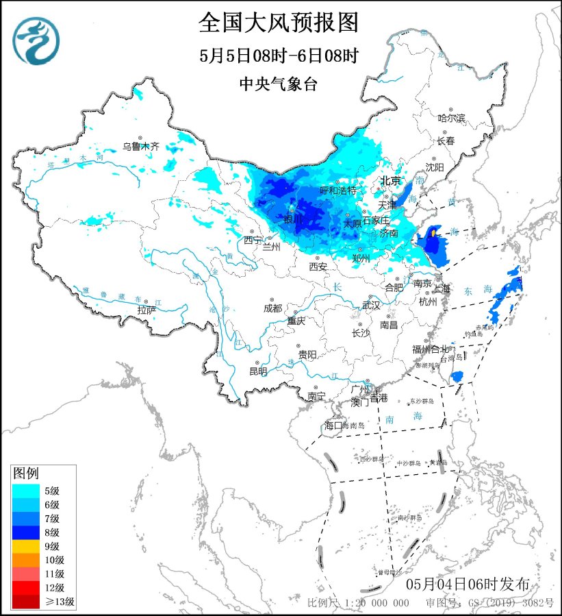 5月5日08时至6日08时,内蒙古中西部、宁夏、陕西中北部、山西大部、河北北部和西部、河南中北部、山东中西部、江苏北部等地有5~7级、阵风8~10级的大风,黄海中西部和西南部将有7~8级、阵风9~10级的大风。