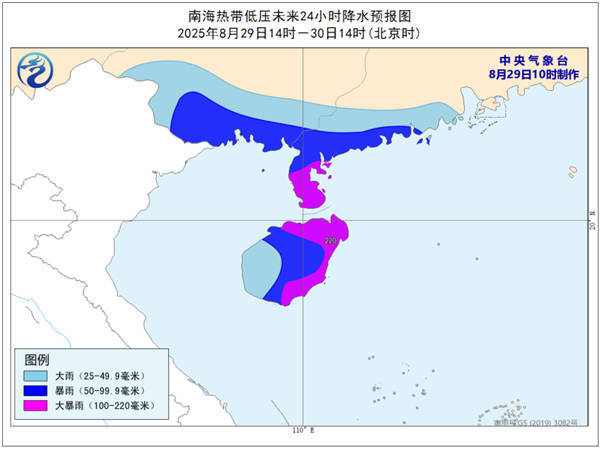 降水预报:29日14时至30日14时,广东西南部、广西南部、海南岛等地部分地区有大到暴雨,其中,广东西南部沿海、海南岛北部和东部等地部分地区有大暴雨(100-220毫米)。
